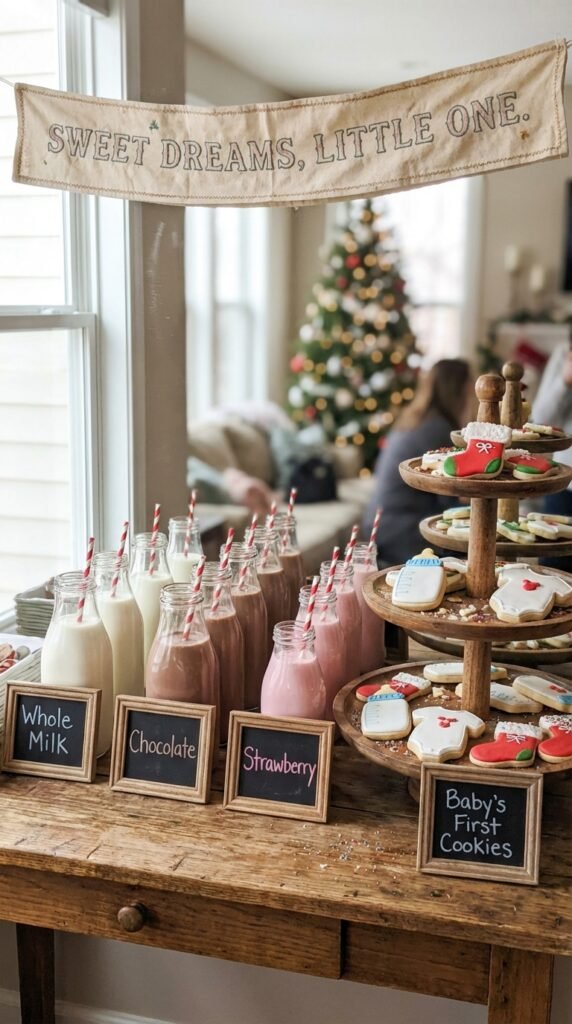 Create a sweet treats selection featuring sugar cookies shaped like baby bottles, onesies, and mini stockings. I love arranging different cookie varieties on tiered stands—think snickerdoodles, chocolate chip, and festive red velvet cookies.