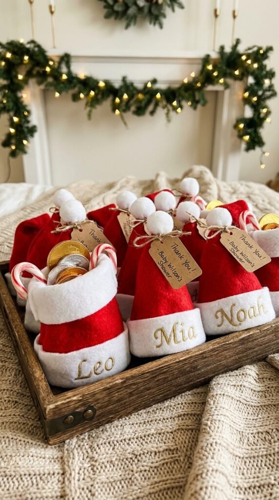What could be more perfect than sending your baby shower guests home with adorable Santa hat party favors that double as instant holiday spirit?