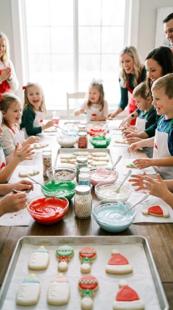 Set up stations with themed cookie cutters featuring baby bottles, rattles, and Santa hats. I’ve found that providing pre-baked sugar cookies saves time and reduces stress. Stock each station with fun cookie frosting techniques like marbling, wet-on-wet designs, and simple piping methods.