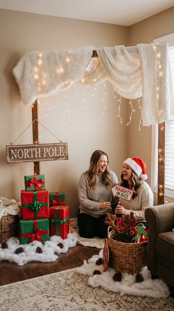 Stack wrapped gift boxes as seating props, add a “North Pole” wooden sign, and scatter artificial snowflakes. Don’t forget festive photo props like Santa hats, reindeer antlers, and “Nice List” signs. Your guests will love posing in this winter wonderland!