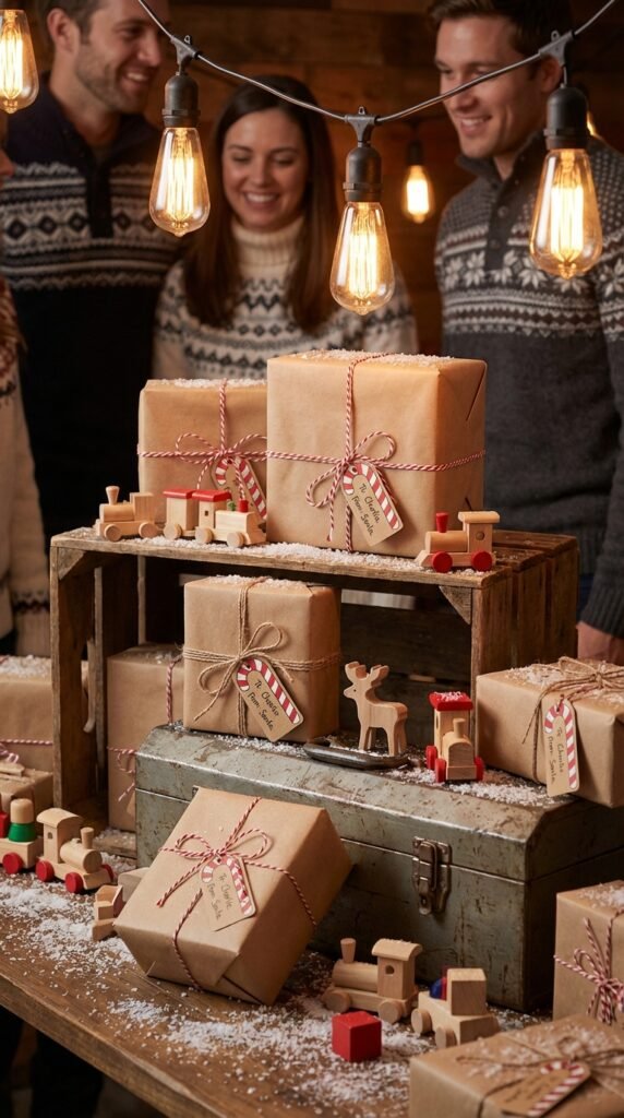Create height variations with wooden crates and vintage toolboxes. Scatter toy trains, building blocks, and faux snow around packages. String warm Edison bulbs overhead for that authentic workshop glow that’ll make everyone believe Santa’s elves just stepped out for cocoa.