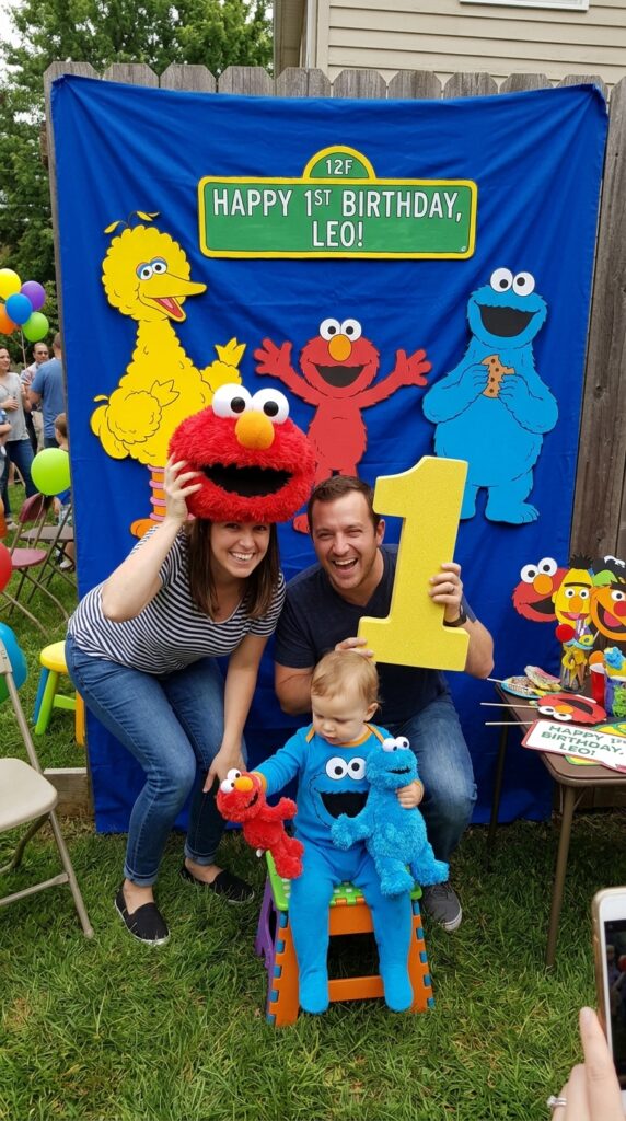 Set up a colorful Sesame Street props backdrop featuring Elmo, Big Bird, and Cookie Monster behind a designated photo spot.