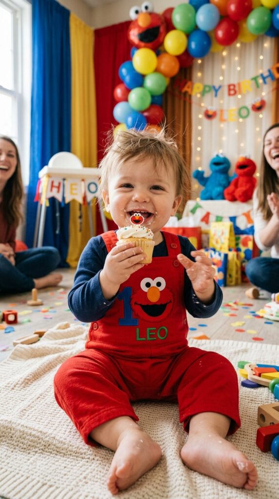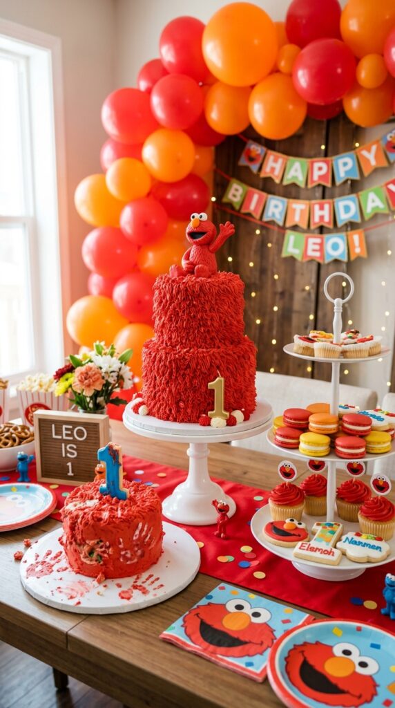 For the cake smash, go with a red furry cake smash setup — think fluffy red frosting, a tiny Elmo topper, and a matching smash cake just for your birthday star.
