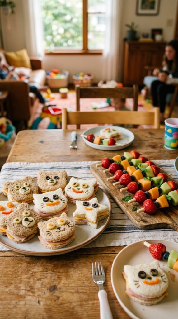 You’ll want colorful fruit skewers loaded with strawberries, blueberries, and melon chunks — they’re practically edible decorations. Keep portions small and manageable for tiny hands.