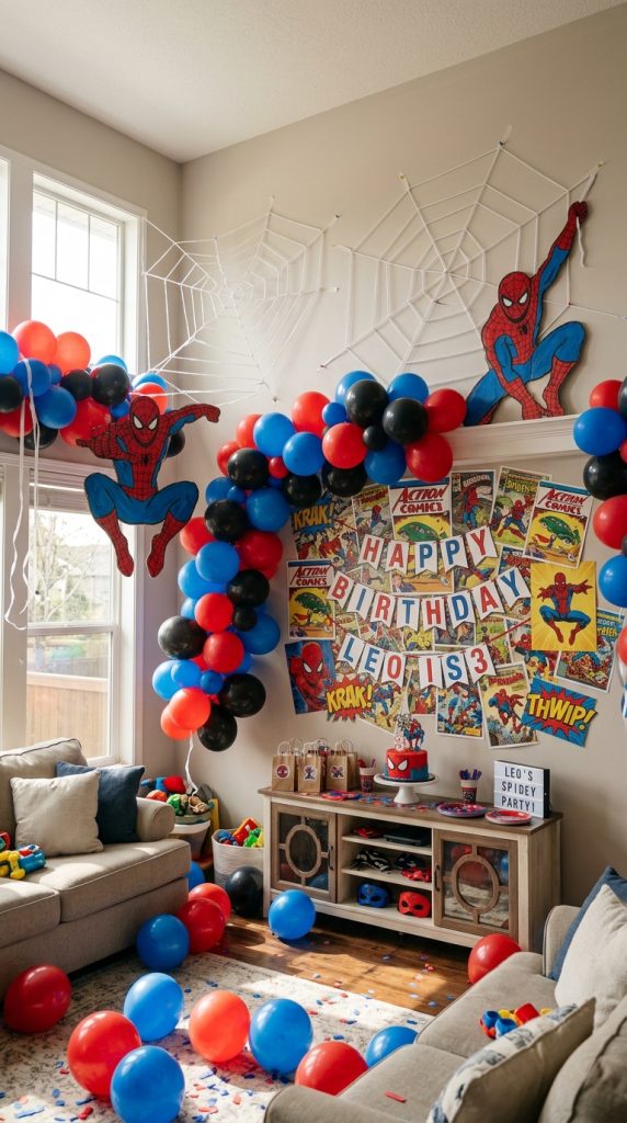Print a comic book backdrop on large poster paper from any office supply store — it’s cheap and genuinely stunning. Red and blue balloons clustered together instantly scream Spiderman without costing much.