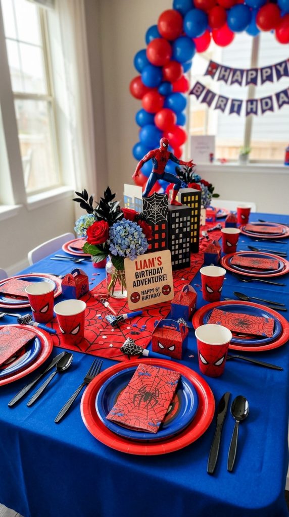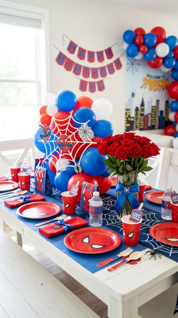 Grab themed tableware featuring Spiderman’s iconic red and blue palette—plates, cups, and napkins tie everything together instantly.