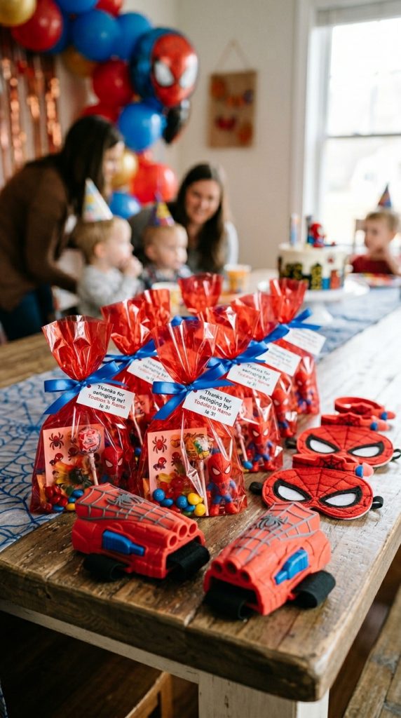 Fill small bags with Spider Man masks that actually fit toddler faces — trust me, sizing matters here.