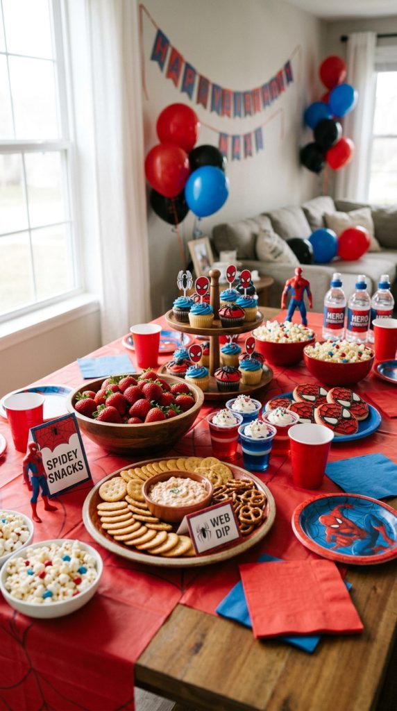 Try web themed snacks like round crackers with cream cheese webs piped on top — kids absolutely lose their minds over these. Strawberries dipped in red chocolate make perfect little “Spidey” bites too.
