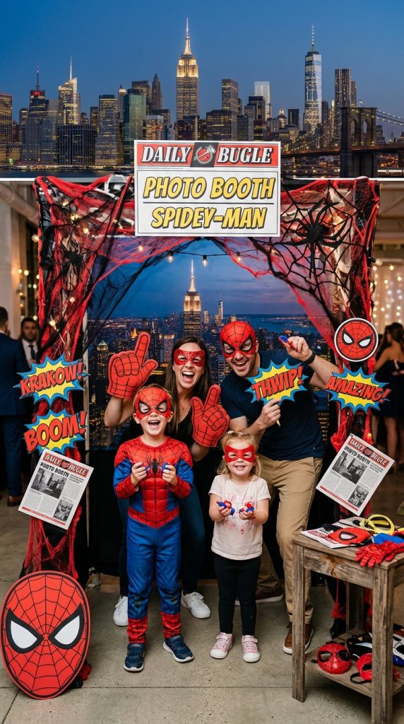 Set up background themes like a NYC skyline or a giant web backdrop. Then pile on the costume props — tiny masks, web-shooters, and oversized Spidey gloves work perfectly.