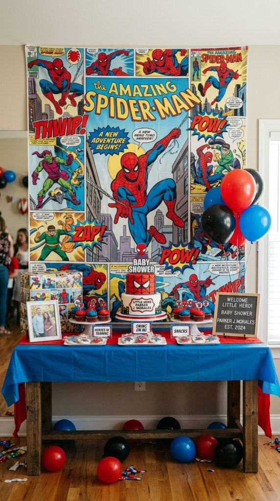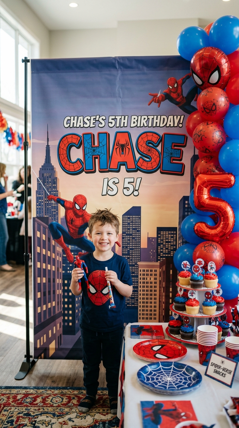 This backdrop style also pairs perfectly with Spiderman party ideas designed specifically for girls who love the web-slinger, making it an empowering and stylish choice for any young fan.