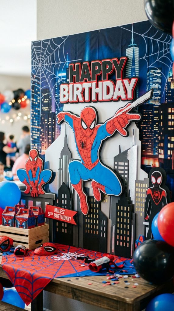 Miles Morales fan art-style banners photograph incredibly well, giving your party that cool, contemporary edge traditional Spider-Man designs simply can’t match.