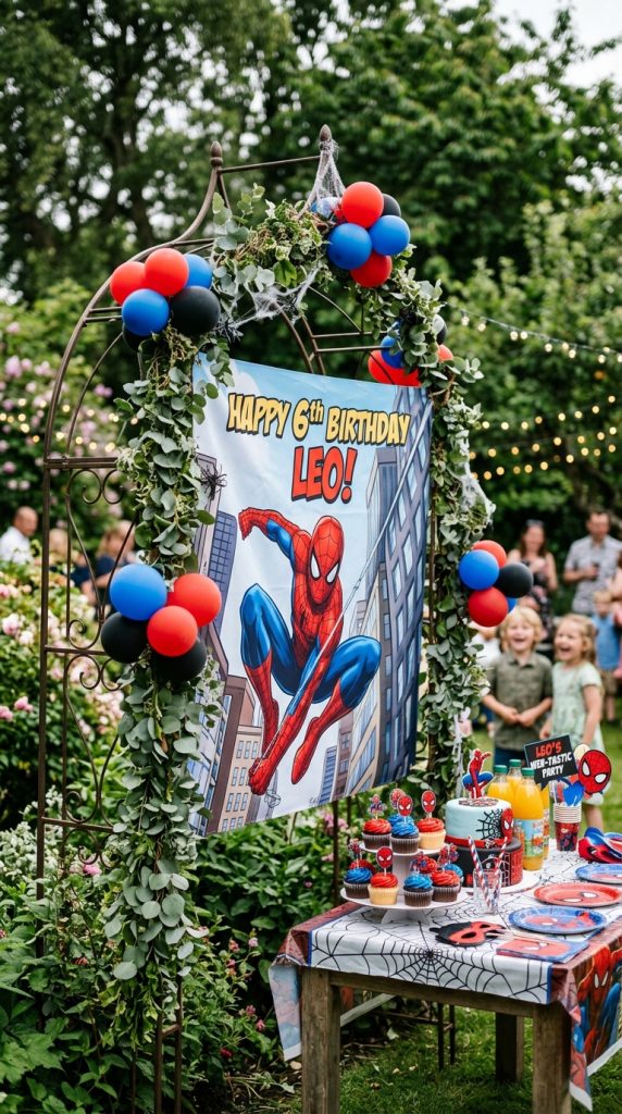 Drape a red-and-blue Spiderman banner across a garden arch for an instant, eye-catching photo spot.