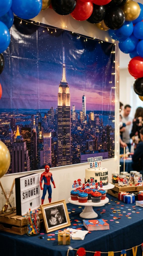 The NYC skyline is basically Spiderman’s second home, so a cityscape backdrop makes perfect sense for your party. Look for designs featuring detailed nyc skyline buildings with iconic structures like the Empire State Building and One World Trade Center.