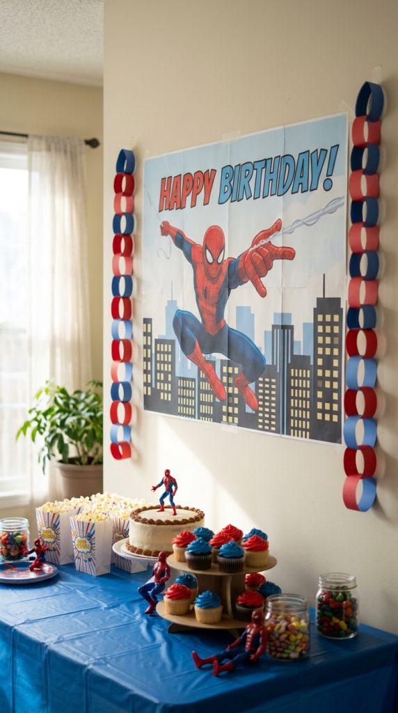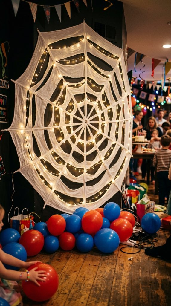 Hang one behind the cake table or photo booth area for maximum impact. Trust me, every photo taken in front of it will look absolutely fantastic. Pairing your backdrop with web-inspired setups and the iconic red and blue color scheme ties the entire party space together seamlessly.