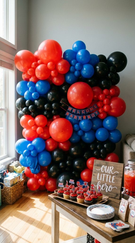 Balloon arches work beautifully here, framing your photo zone with that classic Spiderman palette.