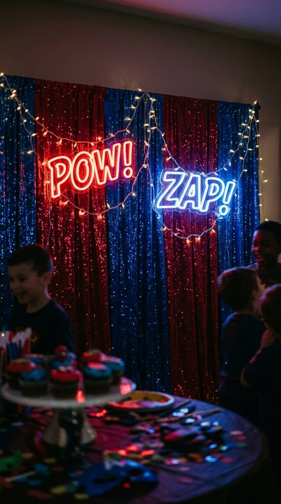 Your guests won’t stop taking photos in front of it. This setup works especially well for a fifth birthday party, where kids love stepping into their favorite superhero’s world.