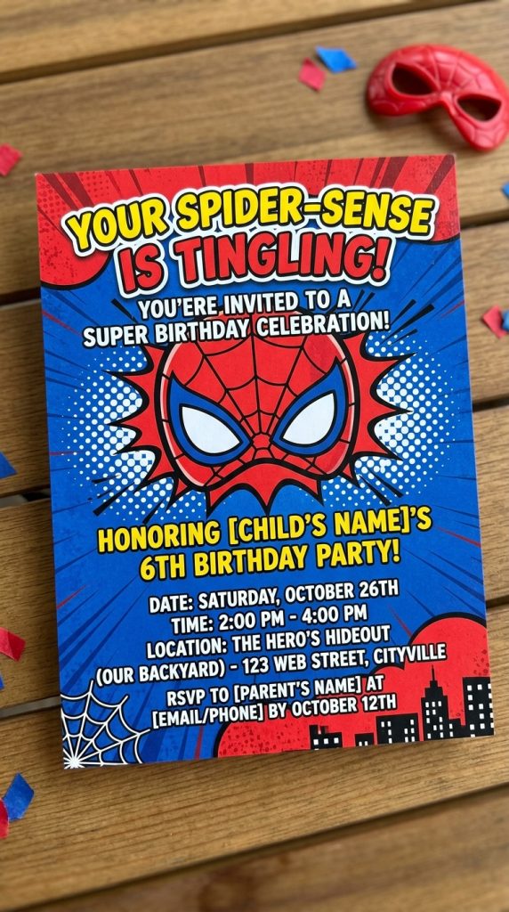 Add details like “Your Spider-Sense Is Tingling” as your headline — it’s fun and gets kids excited immediately. Include the essentials: date, time, location, and RSVP info.