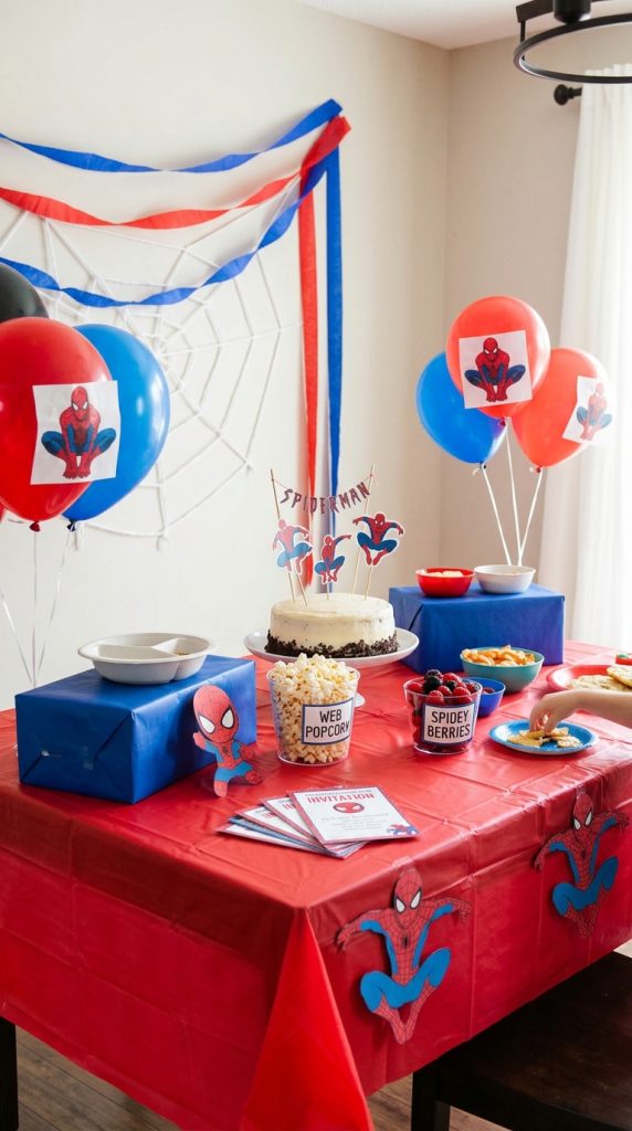 You can also incorporate Spiderman training activities into the party by setting up simple superhero-themed challenges that encourage kids to jump, balance, and move like their favorite web-slinger.