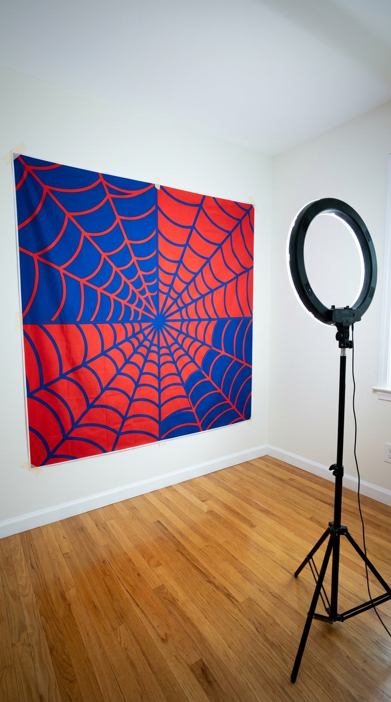 Now that your supplies are sorted, it’s time to give guests a dedicated spot to strike their best Spiderman pose. Hang a red and blue web-printed backdrop against a wall, then scatter themed props like cardboard web-shooters, oversized Spiderman masks, and “thwip” speech bubble signs nearby.