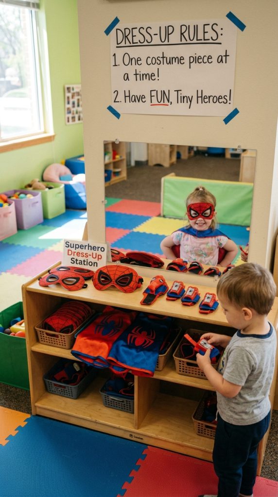 Post simple dress up rules nearby, like “one costume piece at a time” to prevent tumbles.