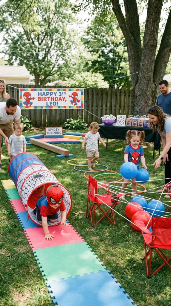 Games at a Spiderman party don’t need to be complicated to get toddlers genuinely excited. Set up a simple Spider Man obstacle course using foam mats, hula hoops, and crawl tunnels. Kids love “web crawling” between stations — it burns energy and keeps everyone laughing.
