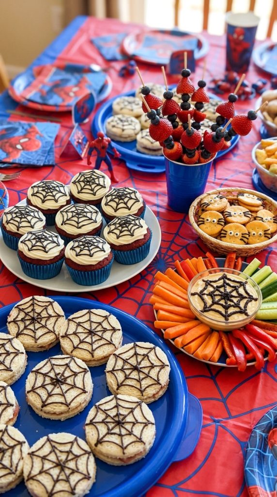 Once you’ve nailed the cake, it’s time to think about the rest of the food spread—and honestly, Spiderman-themed snacks are way more fun to put together than you’d expect.