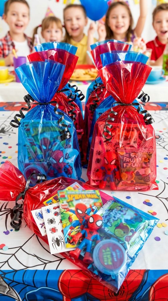 For party favors, think small but memorable. Mini web-shoot conflators, temporary tattoos, and Spiderman stickers pack serious excitement into tiny packages.