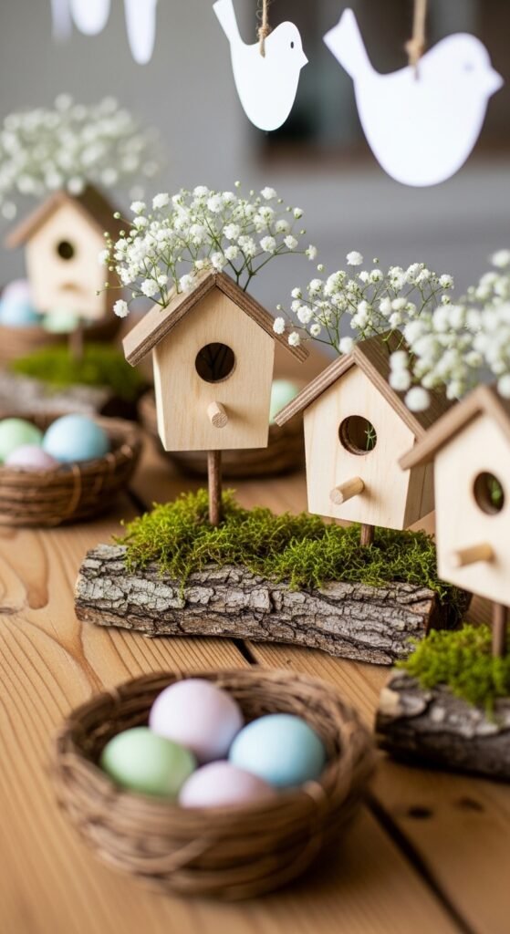 Create charming centerpieces using wooden birdhouse decor as focal points. I love filling small birdhouses with fresh flowers or baby’s breath—it’s surprisingly refined. Arrange moss covered twigs around the base for authentic woodland appeal.