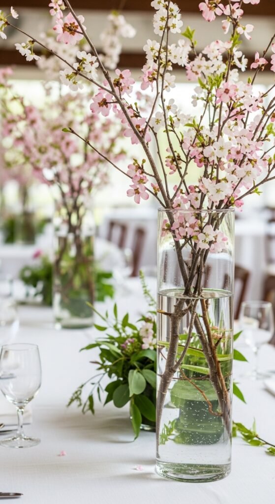 Create stunning centerpieces using branches from japanese cherry blossom trees in tall glass vases. I love mixing real and silk blossoms – real ones photograph beautifully, while silk versions last throughout your entire event.