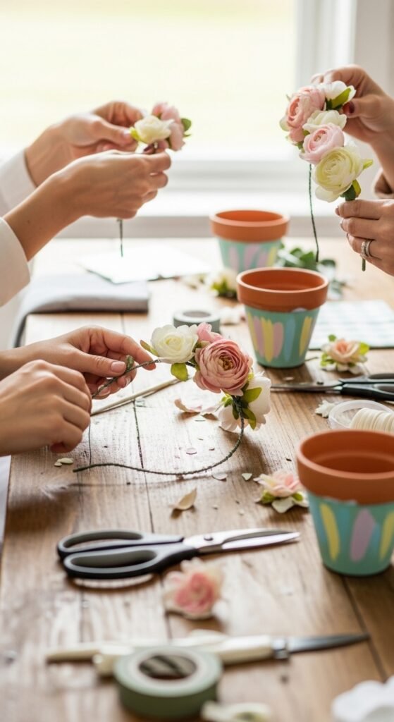 Set up stations with spring themed crafts that double as keepsakes. I love organizing flower crown workshops using silk blooms and wire headbands – everyone leaves looking Instagram-ready!