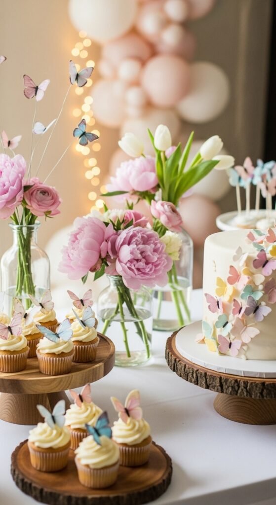 Your butterfly themed dessert table becomes the party’s focal point. Display cupcakes with edible butterfly toppers, sugar cookie butterflies, and a cake decorated with cascading fondant wings. Trust me, guests will be utterly spellbound by these magical details.