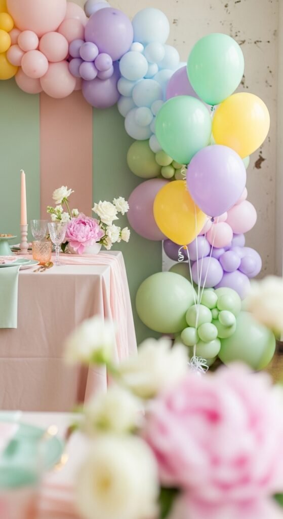 I love combining mint green with peach for something unexpected yet harmonious. Your pastel floral arrangements should echo these hues: white roses with pink peonies, or cream tulips nestled among eucalyptus sprigs. Don’t forget coordinating linens, balloons, and even your dessert table – consistency makes everything feel intentionally gorgeous.