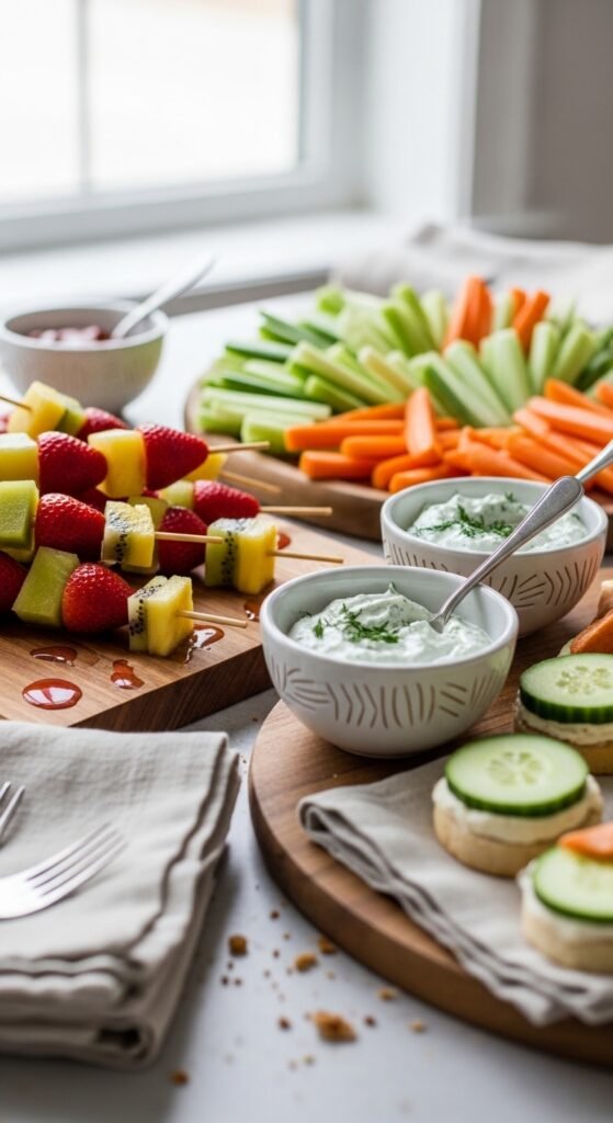Seasonal fruit skewers featuring strawberries, kiwi, and pineapple create Instagram-worthy displays while satisfying sweet cravings. I’ve found they’re conversation starters too—guests love the vivid presentation.