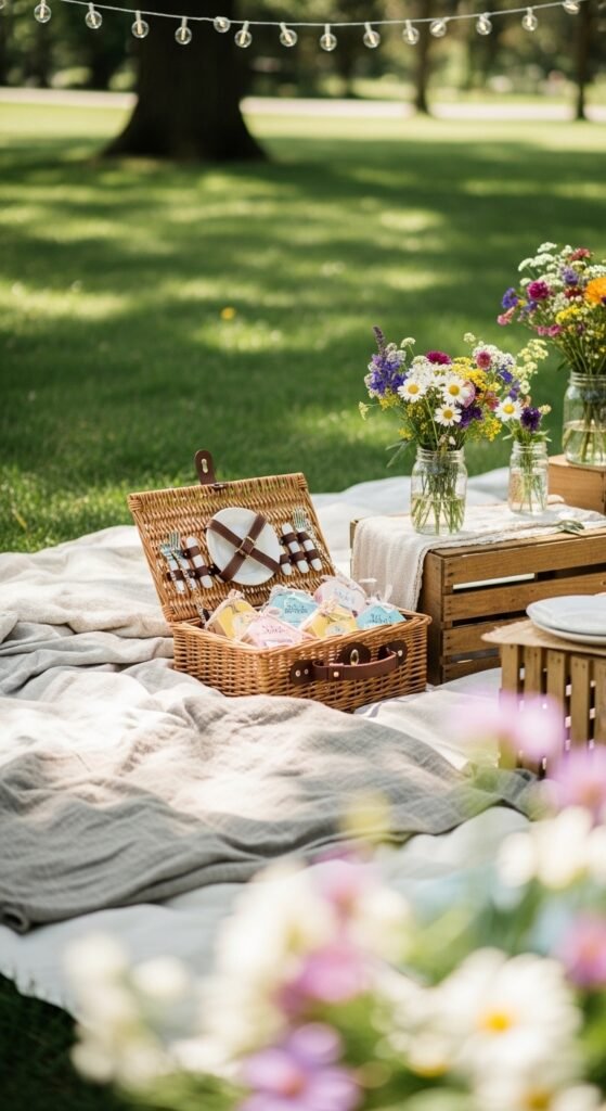 Garden inspired accents like potted herbs double as decorations and party favors. String lights between trees create magical ambiance, while wicker baskets hold everything from utensils to diapers stylishly.