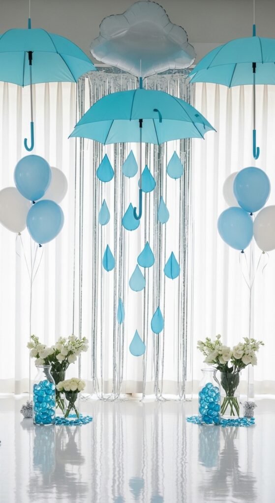 Transform your space with delicate umbrella garlands strung across doorways and windows. I love mixing pastel blue and silver streamers to create cascading “rain” effects from the ceiling. Scatter raindrop confetti across tables for subtle sparkle.