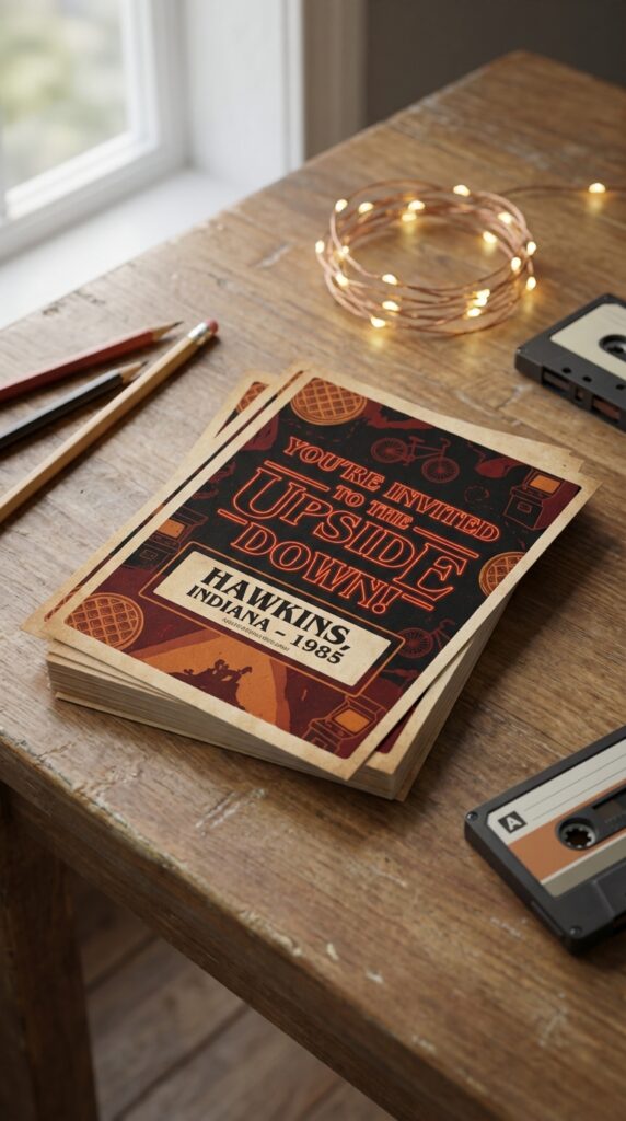 Adding a fun line like “You’ve been invited to the Upside Down” instantly builds excitement. Leaning into retro 80s flair with distressed typography and VHS-style graphics gives your invitations an authentically vintage feel that perfectly matches the show’s aesthetic. Trust me, these little details make guests feel the theme before they even walk through your door.