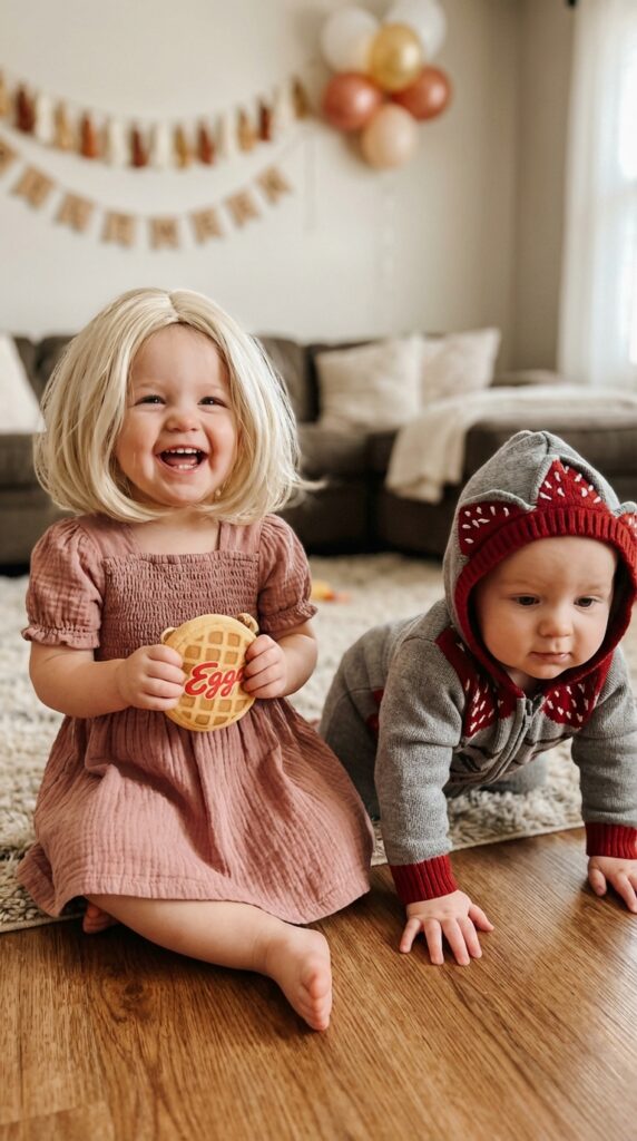 For girls, a mini pink dress with Eleven’s wig is absolutely adorable. Add a tiny Eggo waffle prop, and you’ve got pure magic.