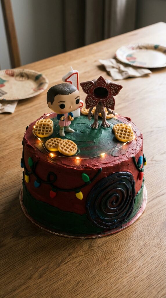Either way, keep the color palette dark — think deep reds, blacks, and greens — so your cake screams Stranger Things while still feeling festive for a first birthday.