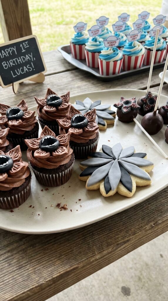You can also expand your spread with Scoops Ahoy cupcakes to bring a fun, nautical contrast to the darker Demogorgon-themed treats.