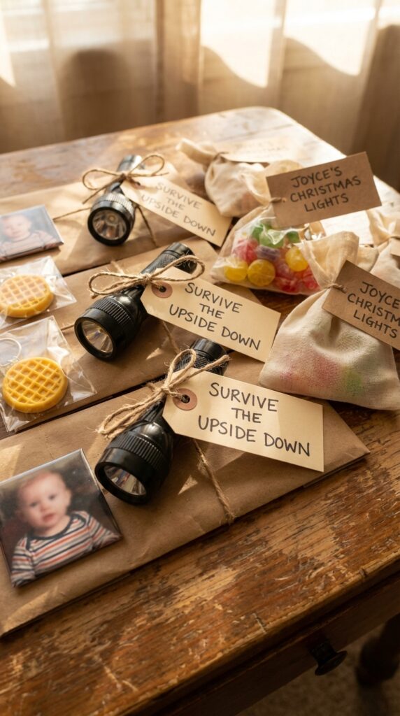 Other crowd-pleasers include small Eggo waffle keychains, custom photo magnets, or candy bags labeled “Joyce’s Christmas Lights.”