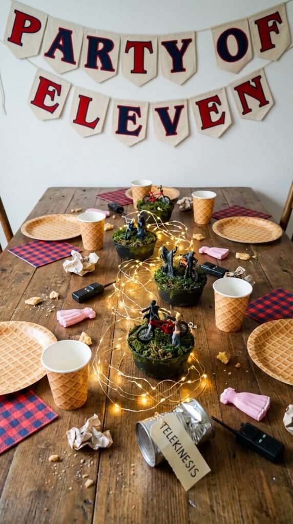 Think “Party of Eleven” banners, waffle-print plates, and string lights everywhere for that perfect sci-fi nostalgia feel.