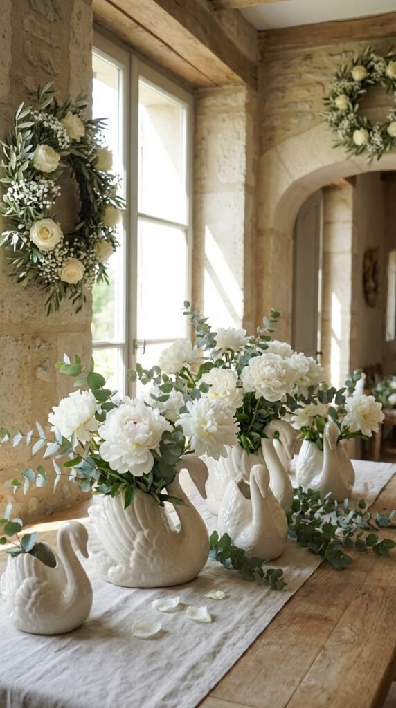 Swan shaped vases filled with white peonies and eucalyptus create stunning table centerpieces. I’ve found these refined vessels work best with soft, cascading blooms that mimic a swan’s graceful neck.