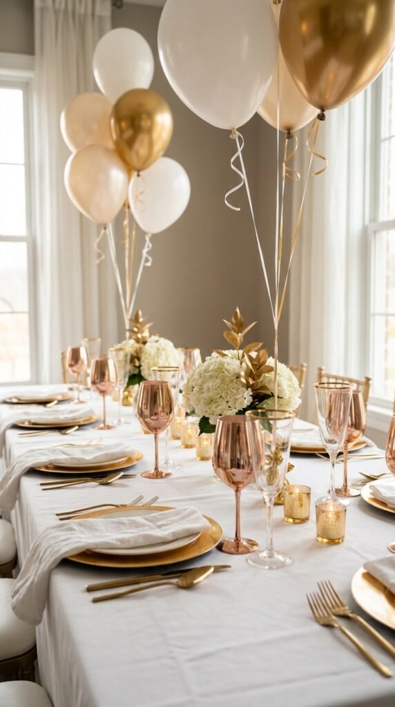Start with crisp white as your base—think graceful tablecloths, napkins, and balloons. Then layer in rich gold accents through chargers, cutlery, and ribbon details. These swan themed color accents work magic when you add metallic swan decorations like gold-painted figurines or shimmery centerpieces.