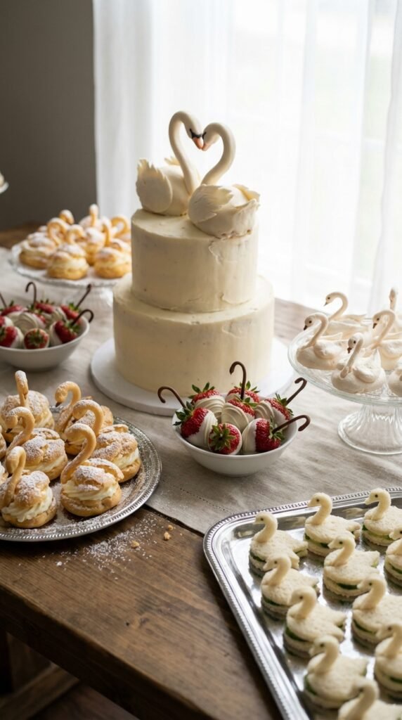 Three show-stopping swan-shaped treats will convert your dessert table into a refined focal pie. Swan shaped cakes steal the spotlight—you can craft sophisticated cream puff swans using choux pastry, or commission a professional baker for stunning tiered swan cakes. I’ve found that cream puff swans work beautifully for DIY enthusiasts since they’re surprisingly manageable.