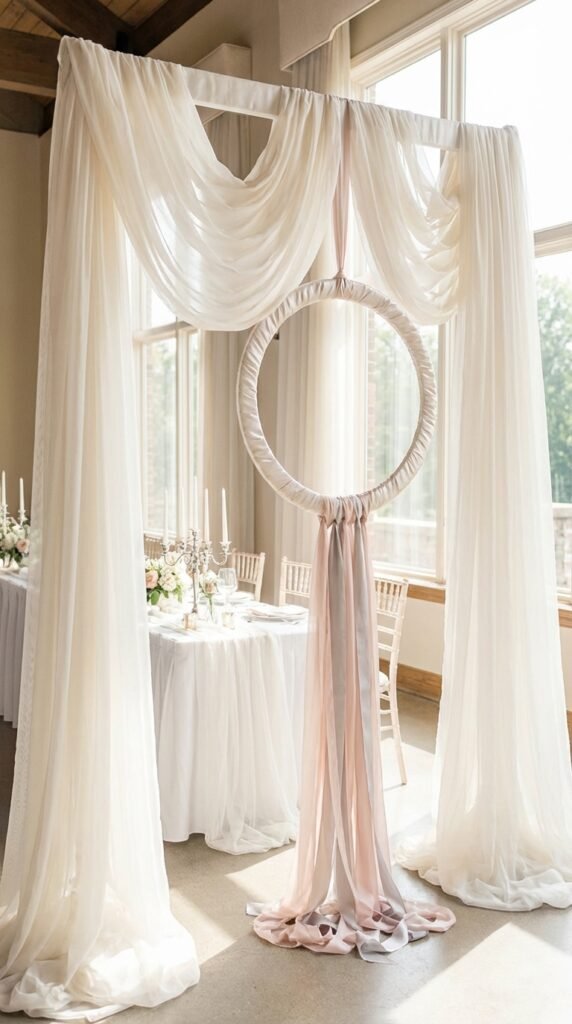 For DIY backdrop designs, consider a circular fabric hoop wrapped in ivory satin. Add cascading ribbons in soft pastels—blush pink and pearl gray look divine. This creates your “swan lake” effect without breaking the budget.