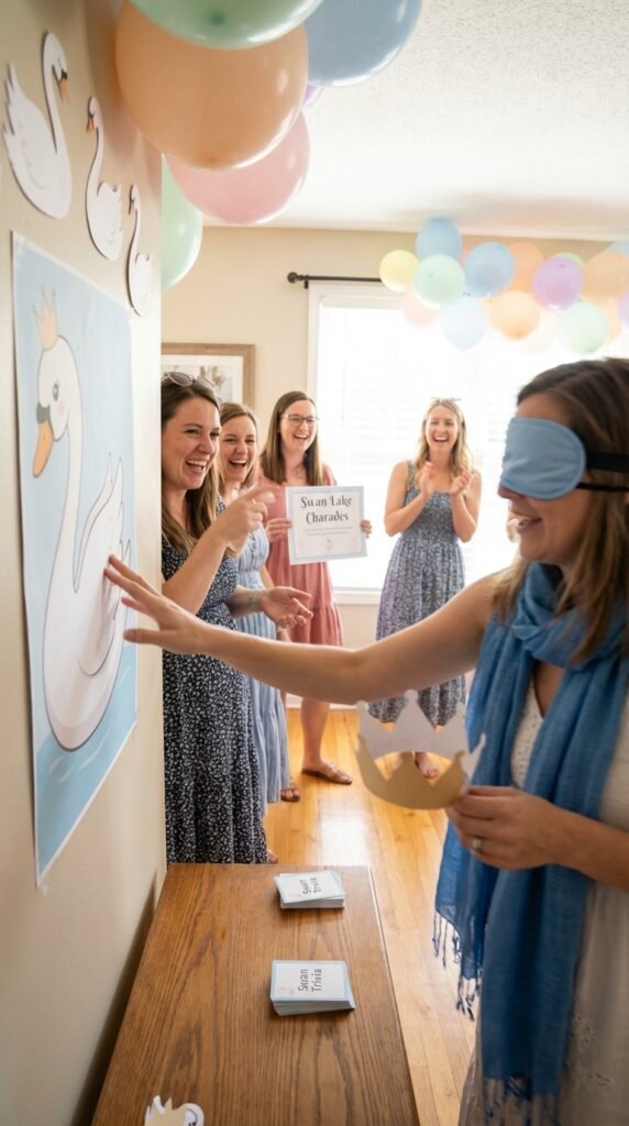 Try “Pin the Crown on the Swan” for active fun. Blindfolded guests attempt placing a sparkly crown on a poster-sized swan.