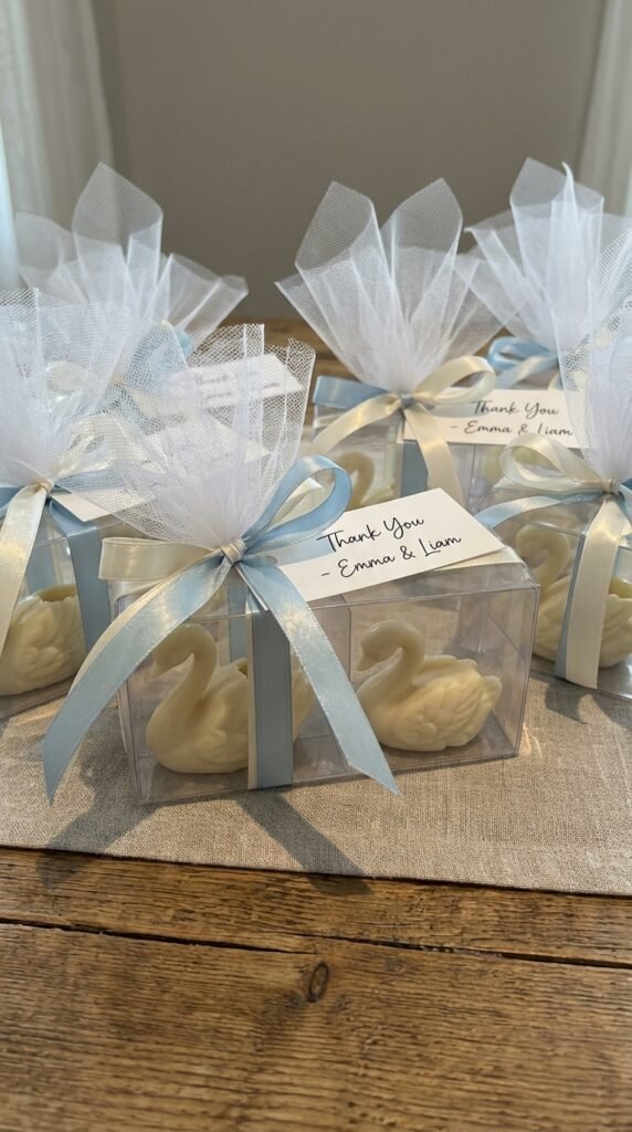 Once your beautiful table setting captures everyone’s attention, you’ll want to send guests home with memorable swan-themed favors that continue the refined experience. Consider creating sophisticated takeaway bags filled with white chocolate swan candies or miniature swan soaps wrapped in tulle.