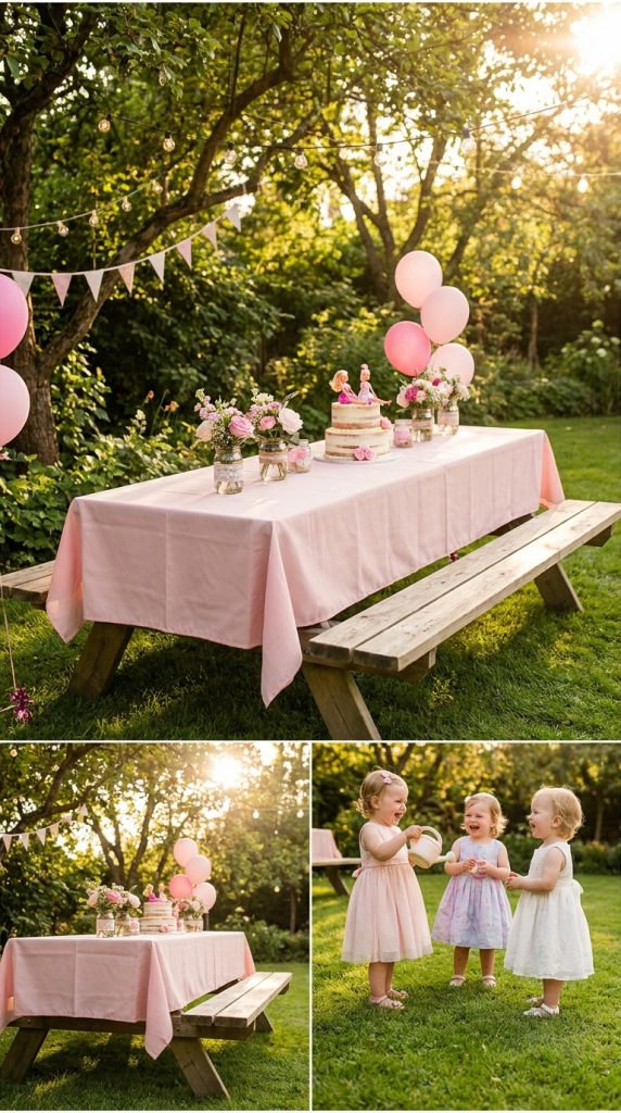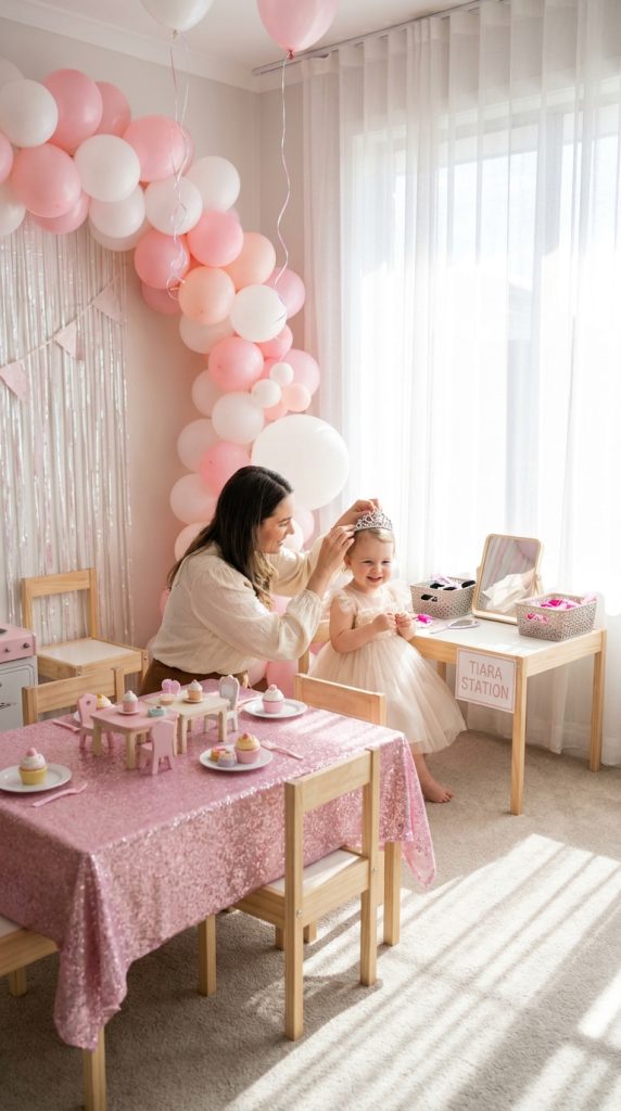 Build a balloon arch using pink, hot pink, white, and gold balloons above the entrance or dessert table. It creates an instant focal point your little guests will absolutely love.