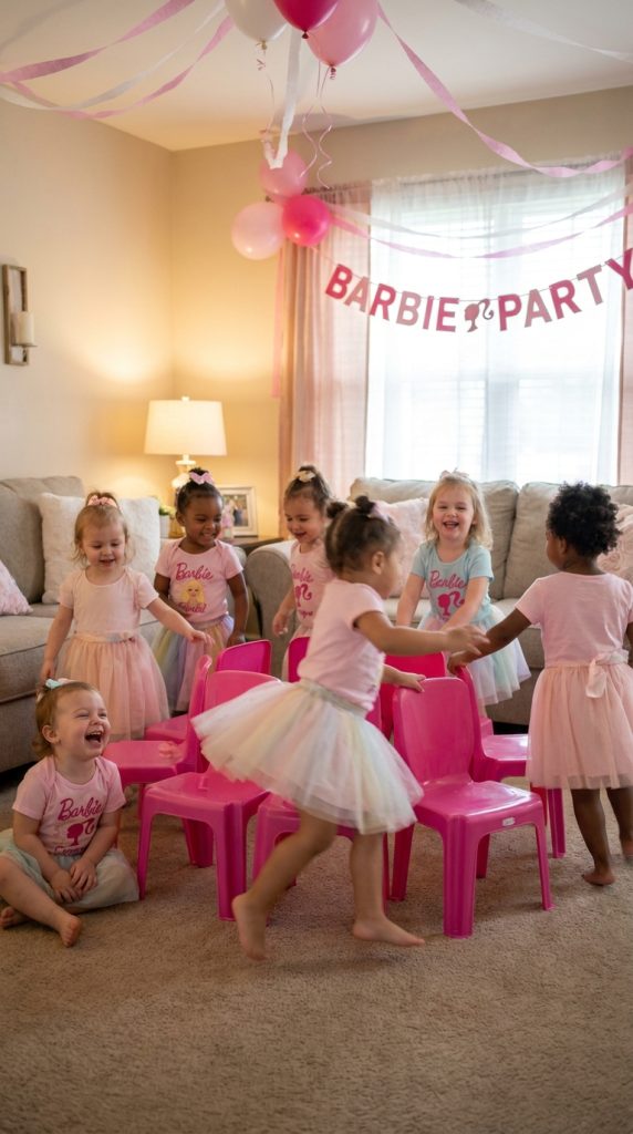 Games are the heartbeat of any toddler party, and Barbie-themed ones keep little ones engaged without overwhelming them. Try Barbie musical chairs using pink chairs decorated with Barbie stickers while playing pop princess songs. It’s surprisingly hilarious watching tiny humans scramble for seats!