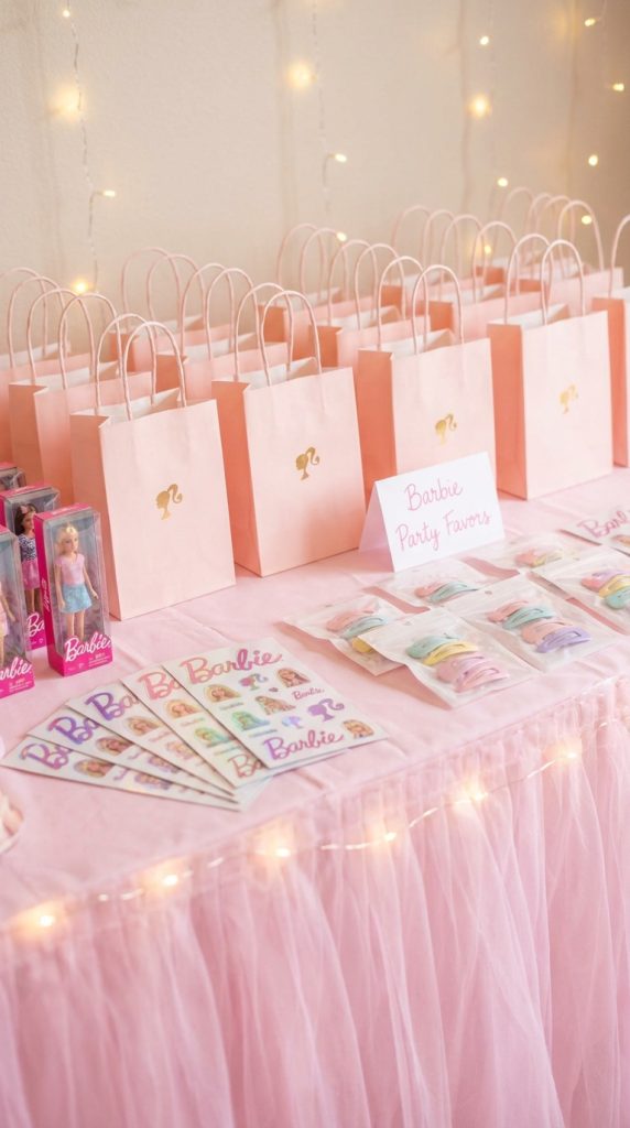 Add a small hair comb or bracelet to round out each bag. Keep favors simple and age-appropriate — nothing with small choking hazards. Coordinate the bags with your pink accent tableware to tie the whole party aesthetic together beautifully.
